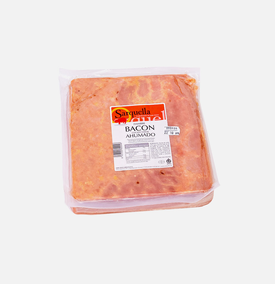 Media pieza de bacón cocido y ahumado molde. Producto de gran rendimiento, buena presentación y calidad