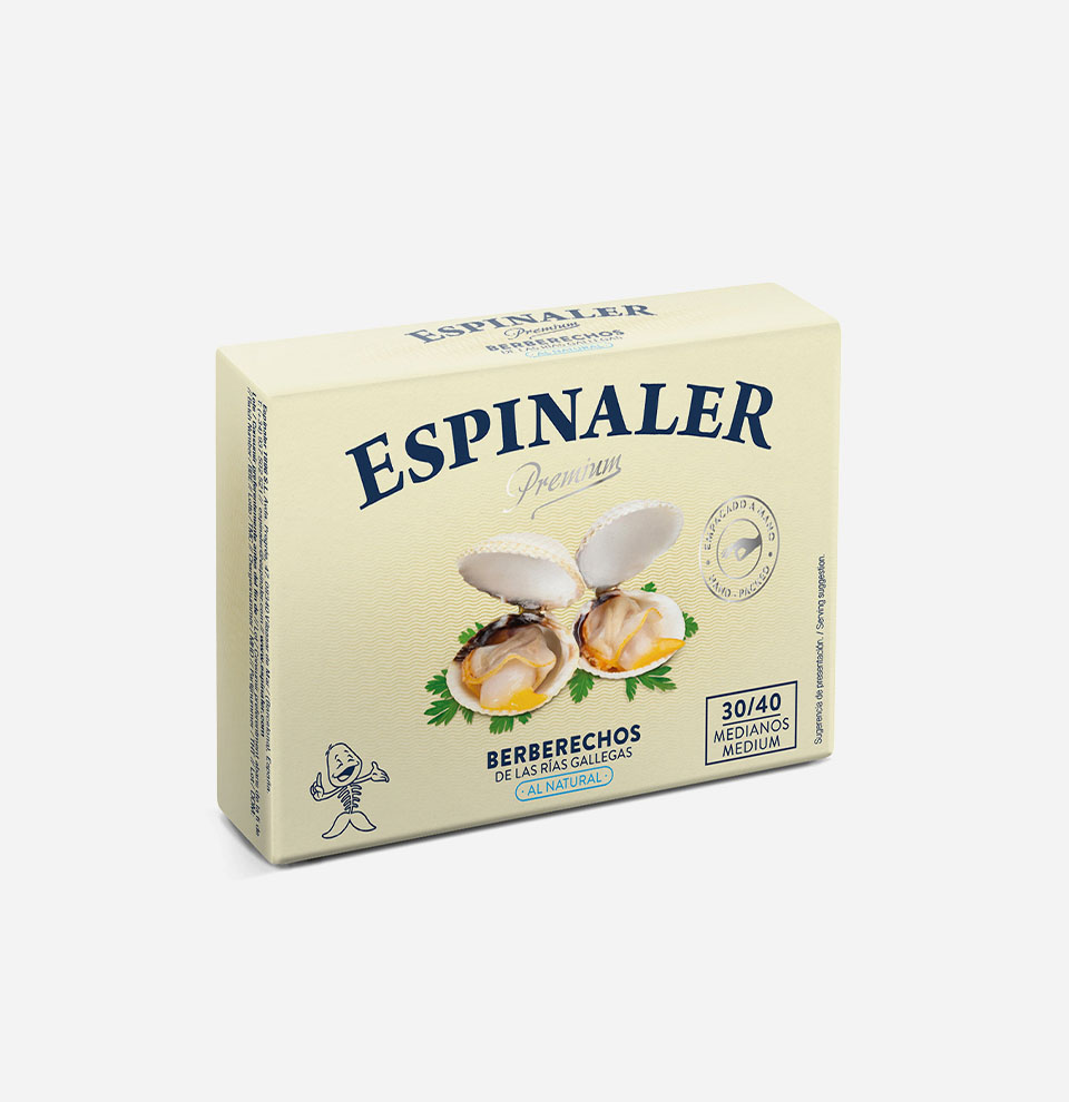 Los Berberechos Premium al Natural Espinaler son cuidadosamente recolectados en las prestigiosas y apreciadas playas de las Rías Gallegas. En Espinaler, siempre hemos abogado por una explotación responsable y sostenible de estos recursos marinos, lo que nos ha permitido mantener el equilibrio delicado del ecosistema marino y asegurar la calidad de los mejores Berberechos Premium Espinaler de generación en generación. Tras un minucioso proceso de depuración, en el que se seleccionan solo los ejemplares más sobresalientes, son envasados a mano para convertirse en una de las conservas de marisco más apreciadas. Tamaño mediano.