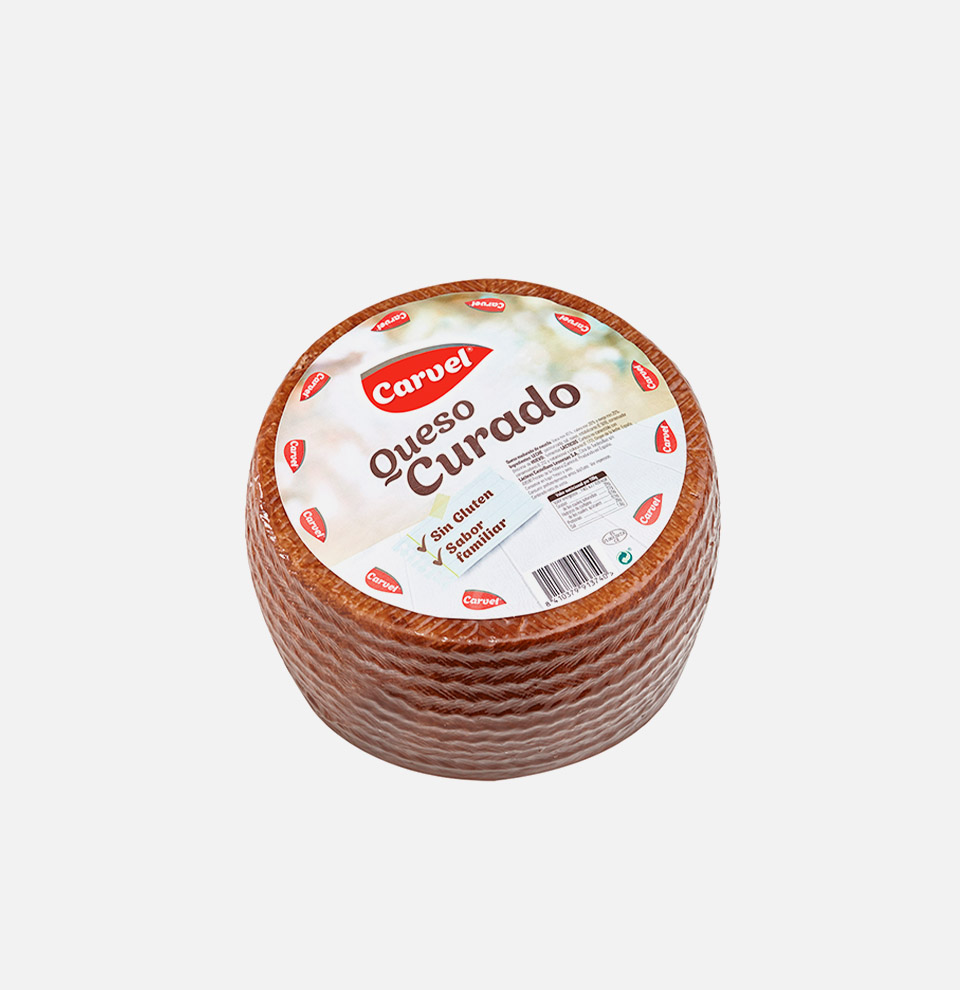 Recubrimiento de color marrón, con cincho. Textura con ojos y flexible, con tendencia a quebradizo. Color amarillento marfil. Olor y sabor marcados, con tendencia a picar.