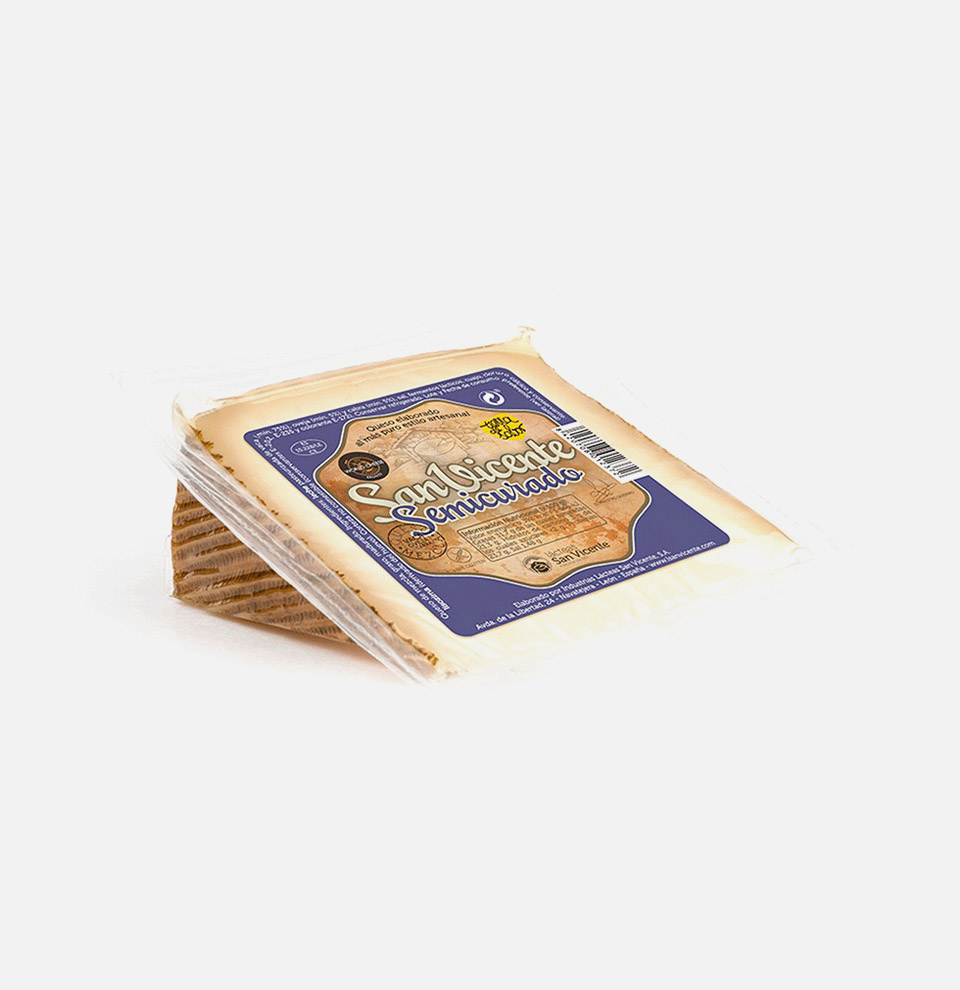 Queso semicurado mezcla San Vicente cuña de 250 gramos, envasado al vacío, caducidad de 6 meses, elaborado con leche pasteurizada de vaca, oveja y cabra. Peso: 0.250kg.
